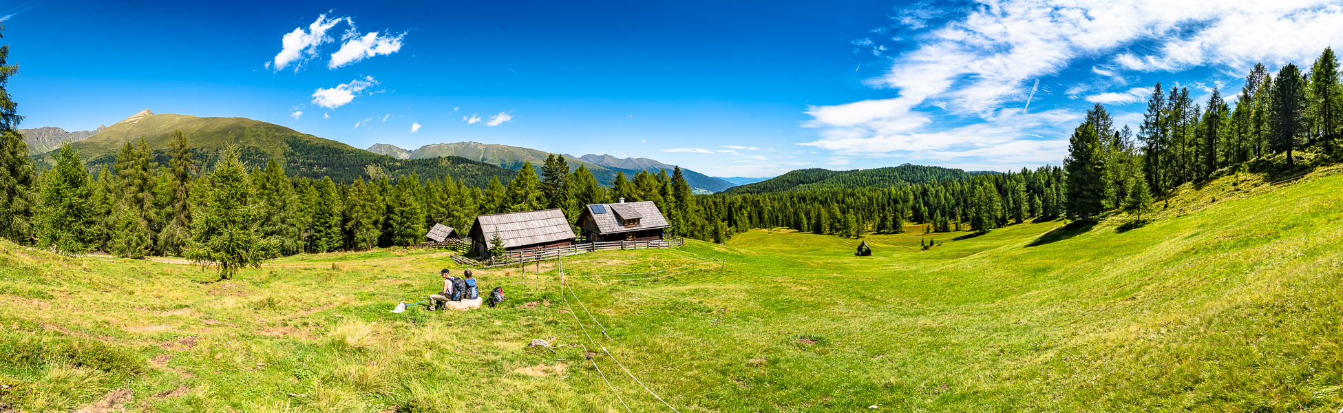 Panoramic picture of the pasture around the Wengerhütte. Preber to the left behind.