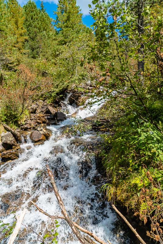 Nach einer Jause bei der Rudolf Schober Hütte geht es weiter das Tal aufwärts. Kleiner Wasserfall neben dem Weg, bei einer Talstufe.