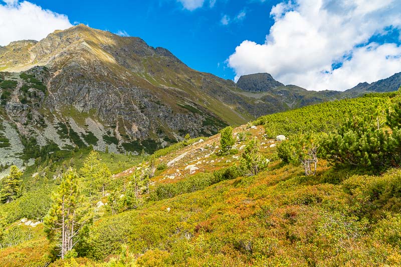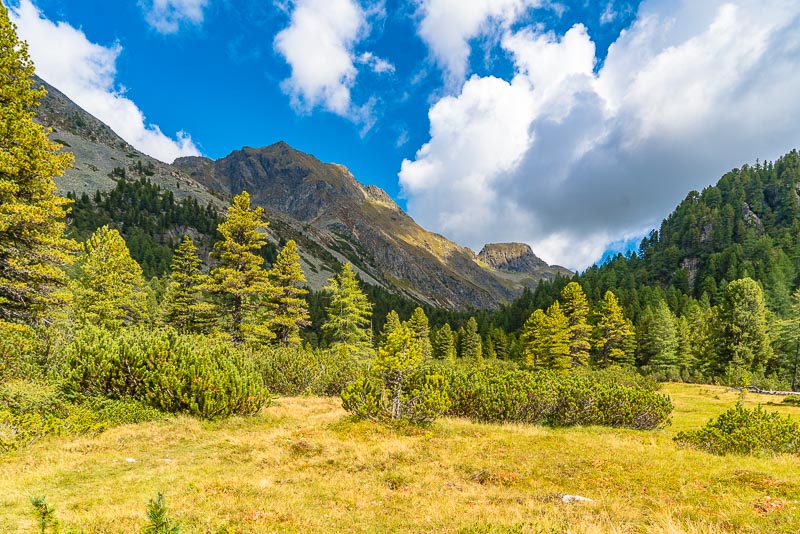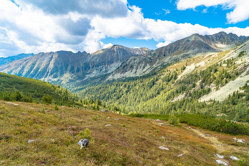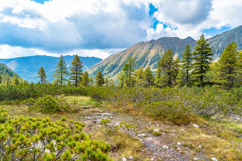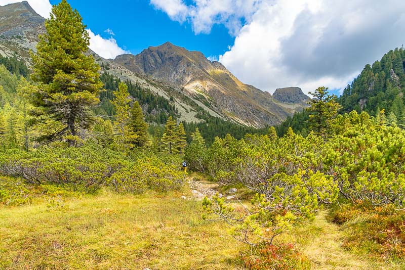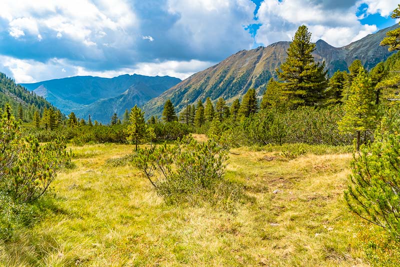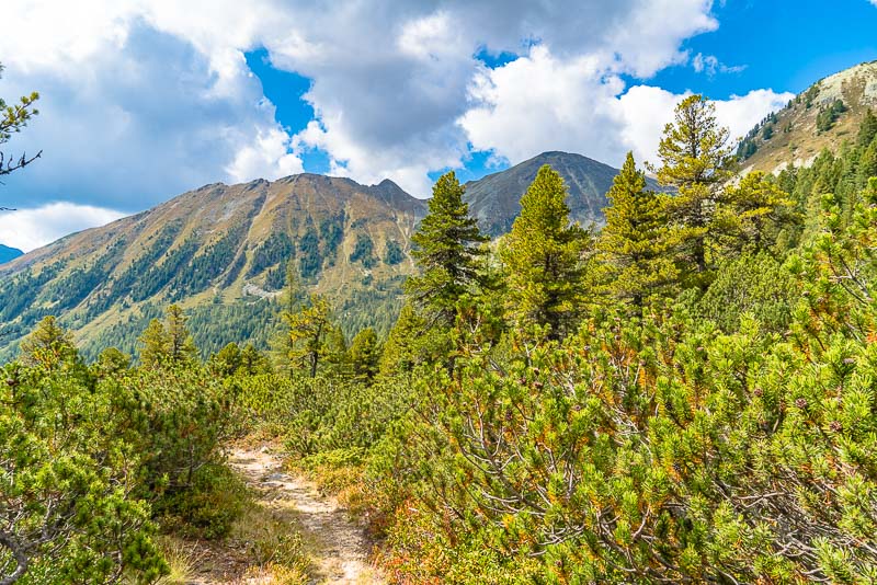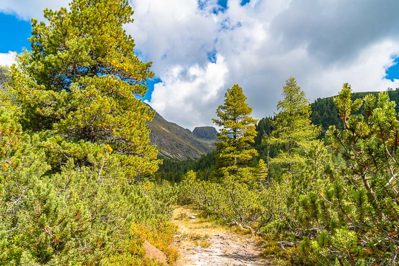 Wir wandern einen schönen, aber unmarkierten Weg zwischen Zirben, Lärchen und Latschen.