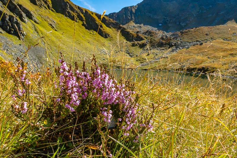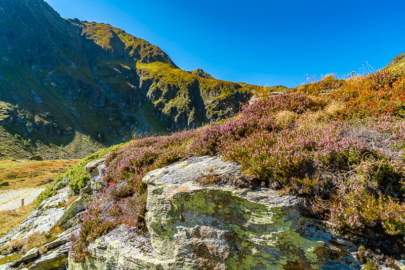 Besenheide in voller Blüte, und die Heidelbeeren bekommen schon rote Blätter.