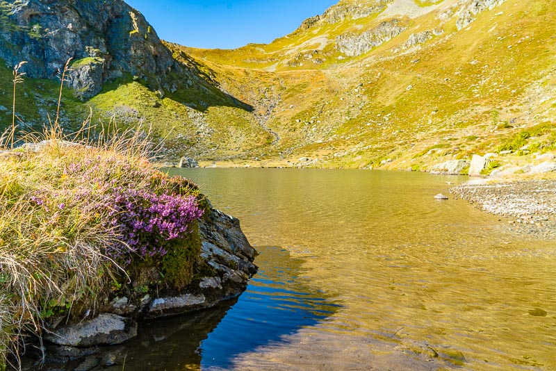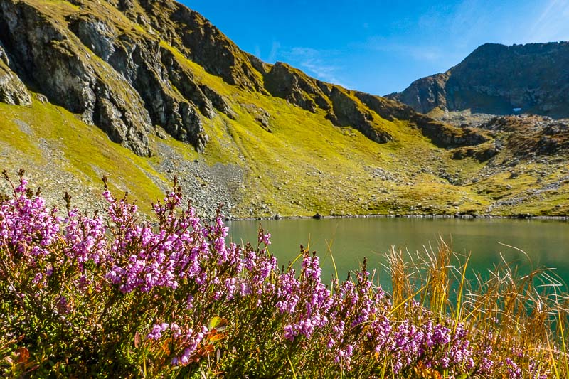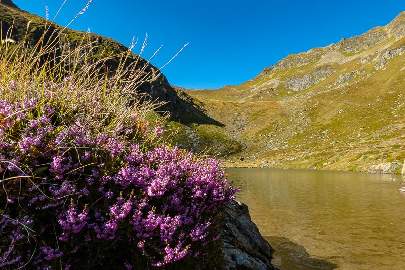 Auf dem Südhang oberhalb des Sees blüht hier in Massen die Besenheide (Calluna vulgaris).