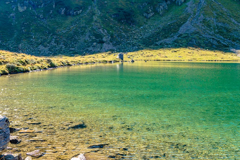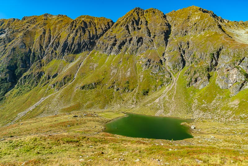 Zurück beim steilen Abstieg zum Rantensee. Im Vergleich sind die Steilhänge dahinter, mit der Knarrnspitze (2.387 m) ganz rechts, jetzt schon im Schatten.