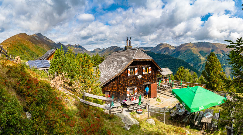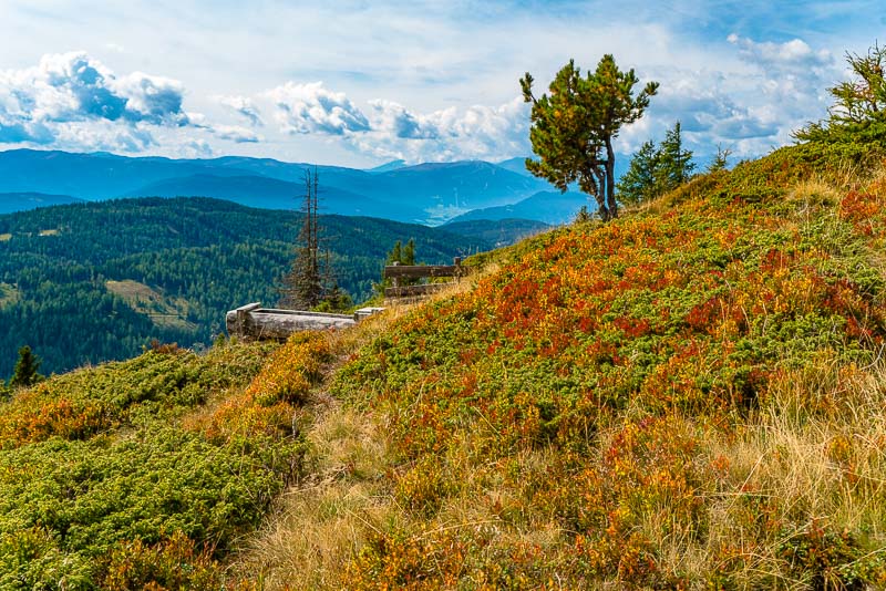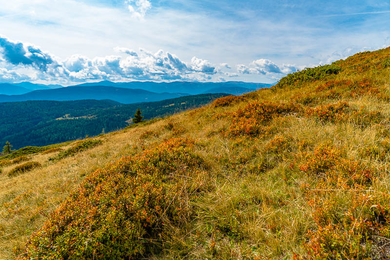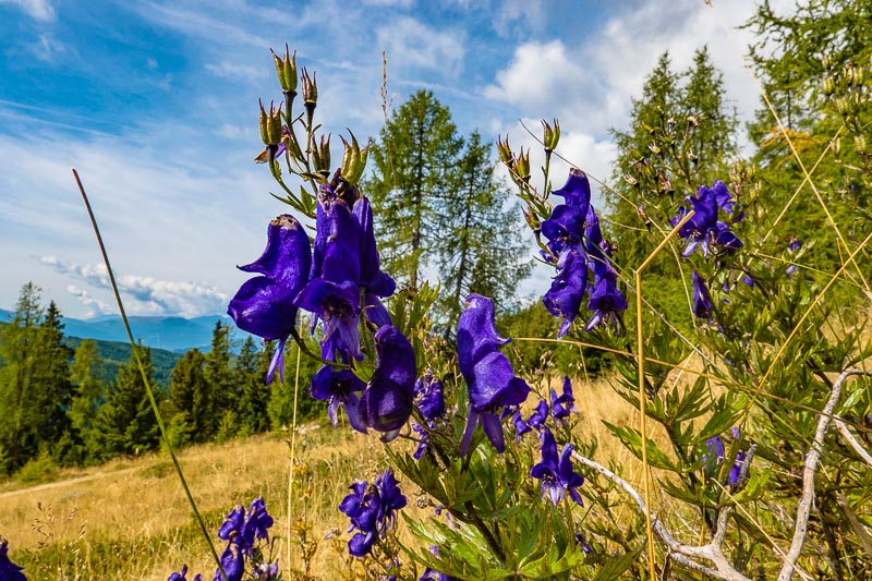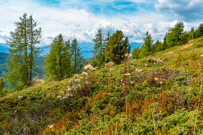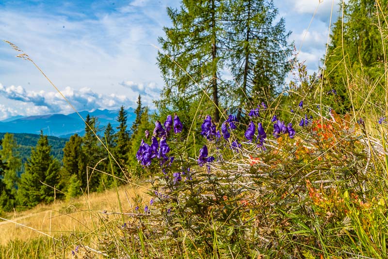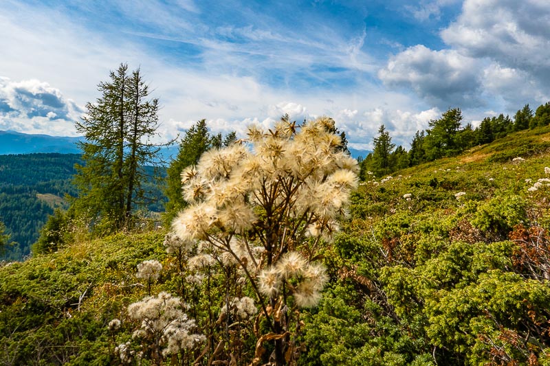 Zunächst geht es fast nur durch Wald, ohne Aussicht. Kurz vor der Hütte kommen wir auf Almwiesen, hier letzte Blüten ...