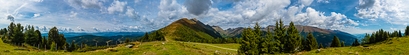 Panorama vom Sattelkogel (1.896 m), neben dessen Gipfel die Grazer Hütte steht (hier rechts neben dem Preber, hinter Bäumen versteckt). Hierher oder ins Bild klicken für eine größere Darstellung.