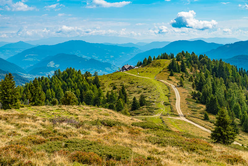 Blick zur Grazer Hütte, dahinter Waidschober, Gstoder und das Hochtal der Krakau.