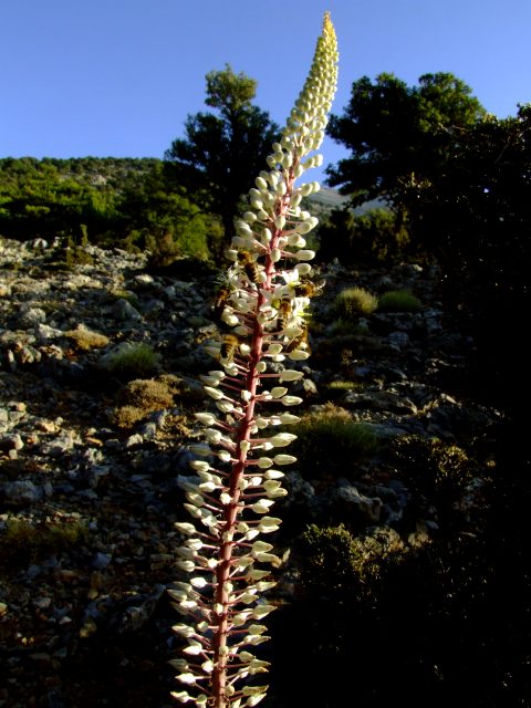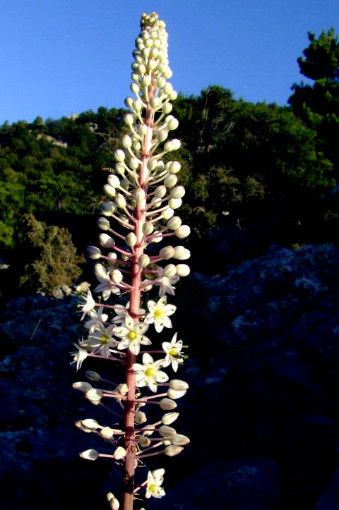 Few, but attractive flowers: squills (urginea maritima) lose all of their leaves in summer, so that the flower stalk, up to 1.5 m high, seems to grow directly from the naked soil.