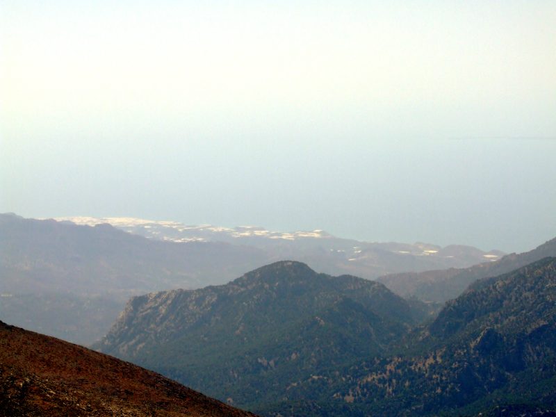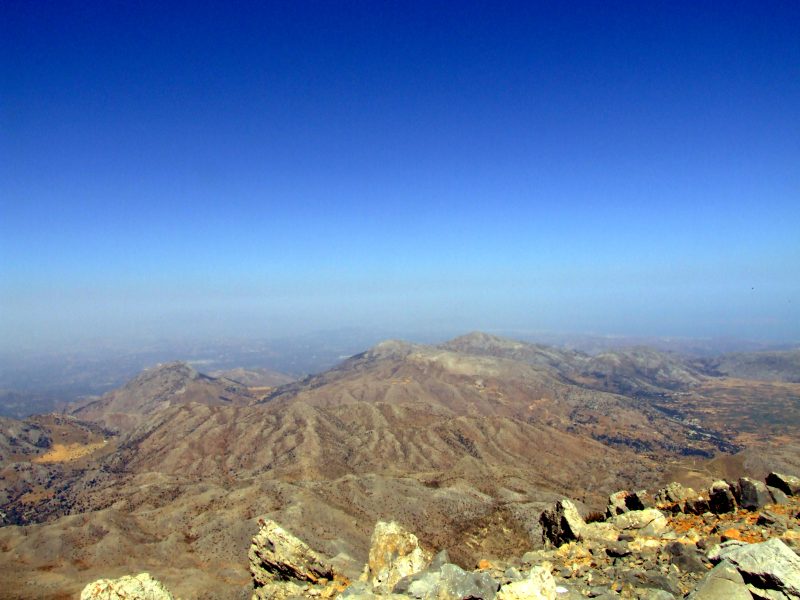 View in eastern direction to Lazaros (2.085 m), behind the summit in the dust Afendis Stavramenos (1.476 m, Thripti mountains)