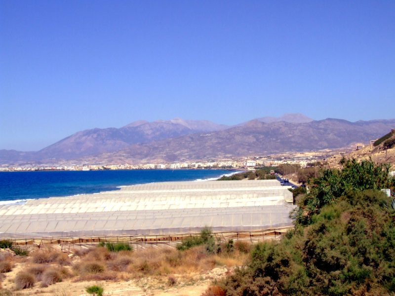 Shortly before Ierapetra: View over greenhouses und the town, with Dikti - mountains behind.