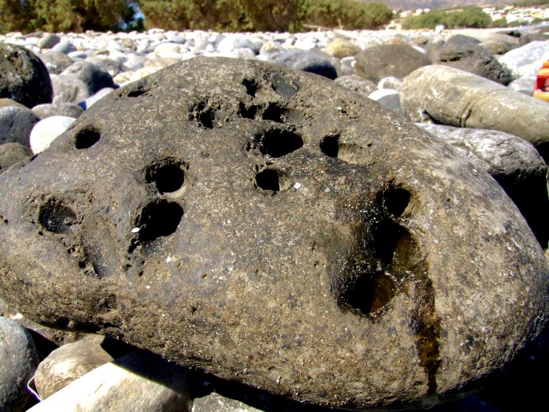 An interesting perforated stone on the beach. Are these holes from drilling scallops?