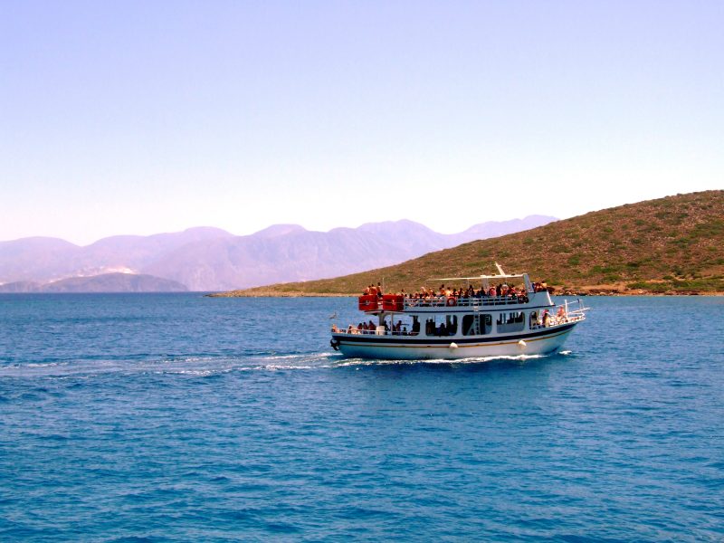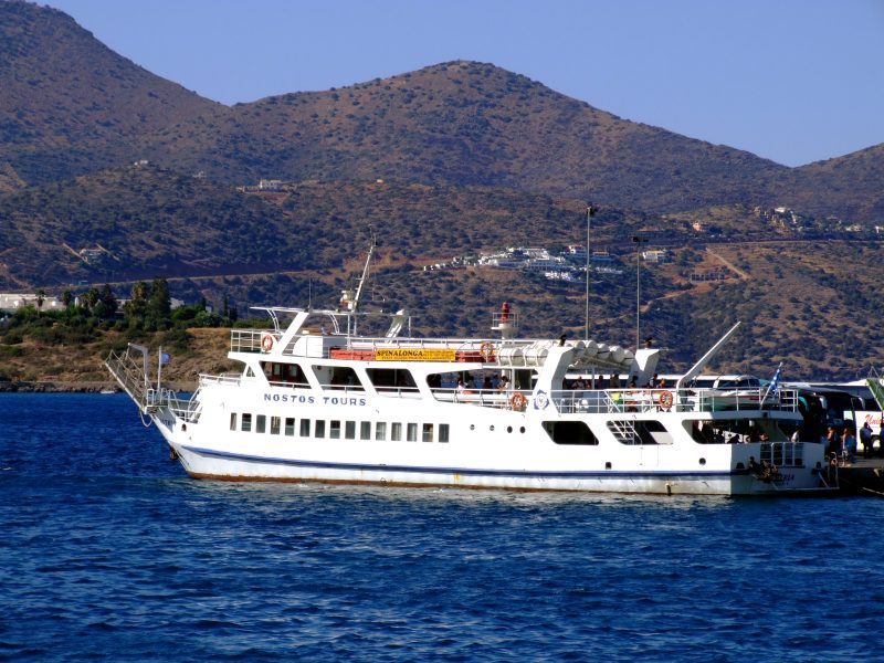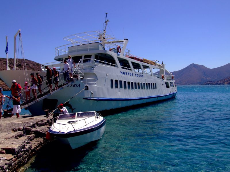 Numerous boats in the haven, with the destination Spinalonga. We enter one of them.