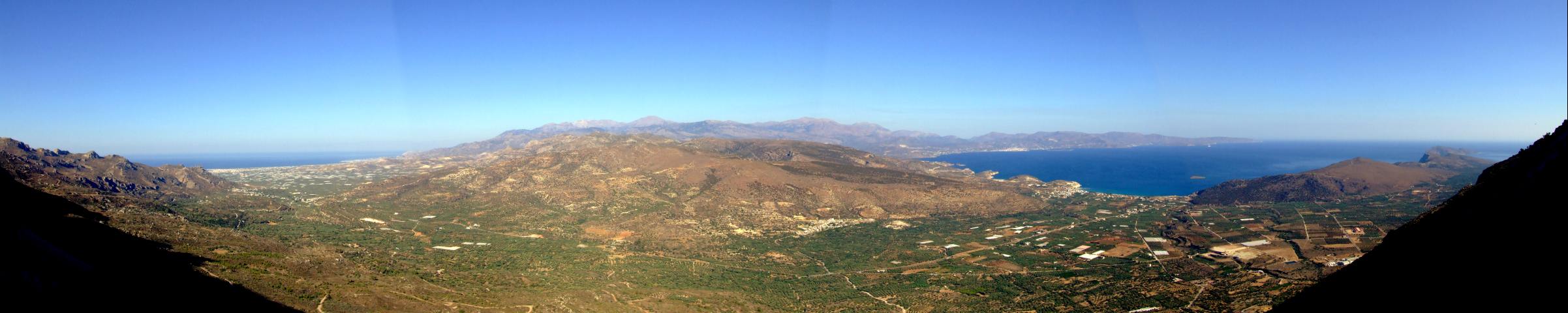 180 Grad - Panorama des schmalsten Teils der Insel Kreta, in der Mitte dahinter das Dikti - Gebirge.