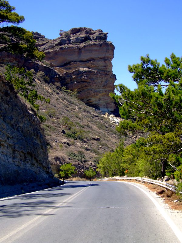 Driving through a valley coming down from Afendis Stavramenos into a cove with this prominent rock directly above the road.