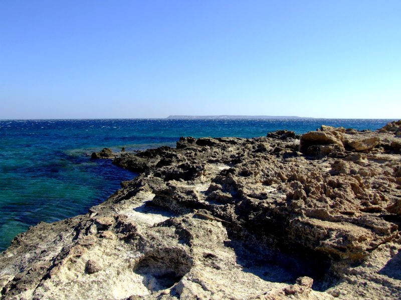 View to the Libyan sea. Overhanging cliffs close to the road.
