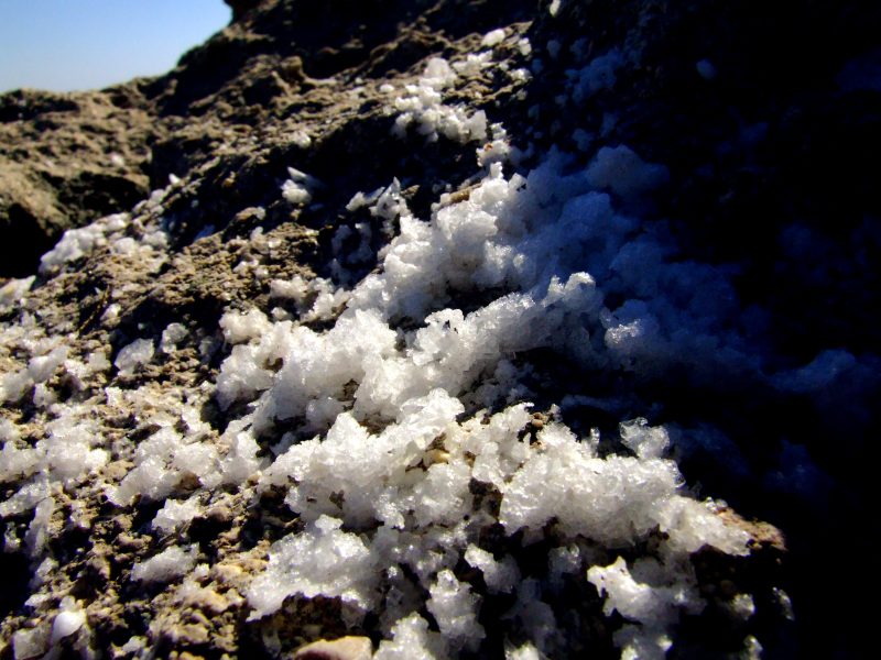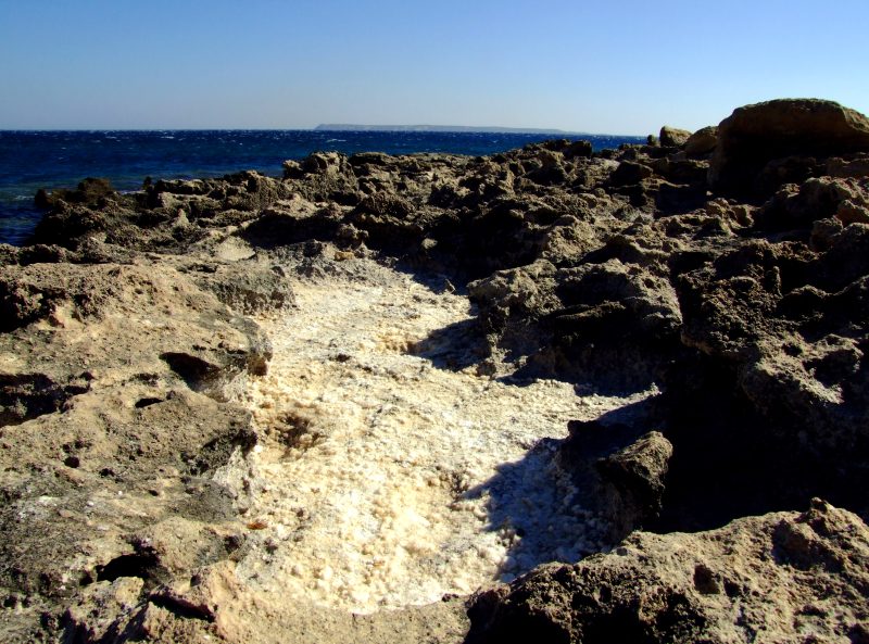 Here I find numerous dry sea water - puddles full of salt crystals, ...