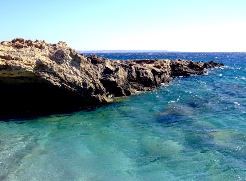 Interesting rock formations near a wonderful grit beach with crystal clear, turquoise green water.