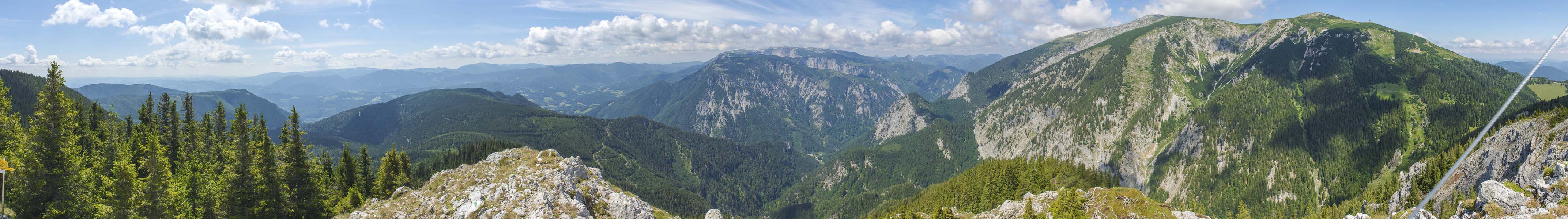 270 Grad - Panorama vom Gipfel des Krumbachsteins (1.602 m). Von links nach rechts: Bucklige Welt, Wechselgebiet, Semmering, Rax, Höllental, Schneeberg.