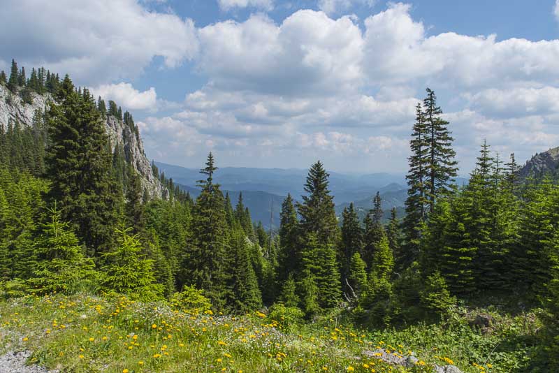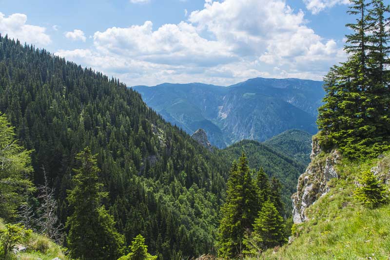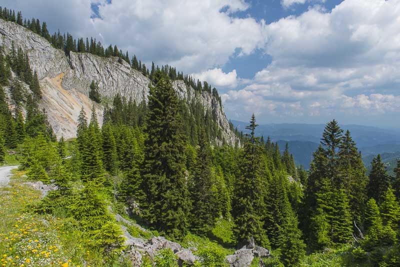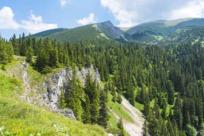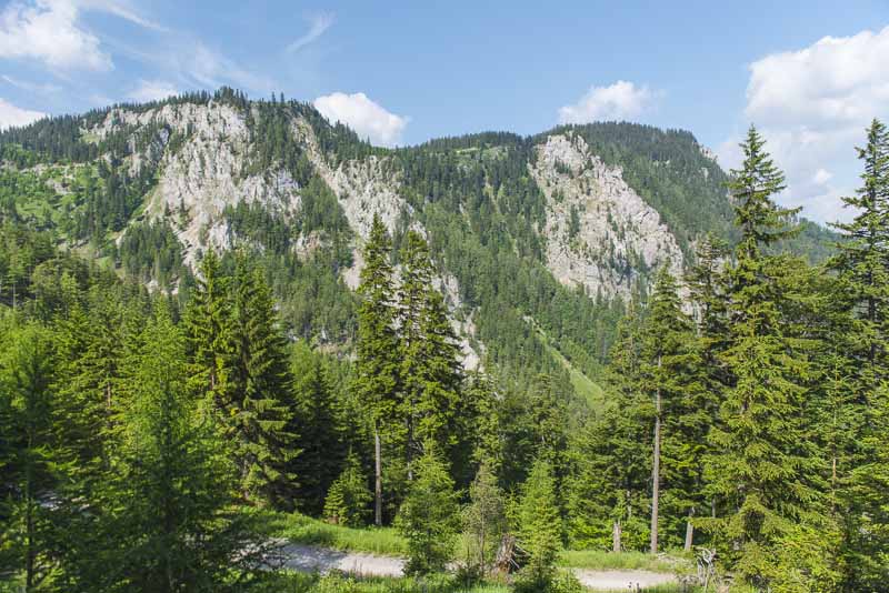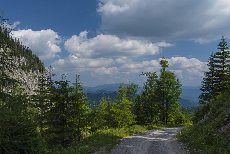 Blick zurück, es geht jetzt eine Forststraße bergauf.