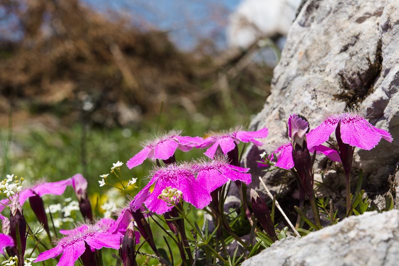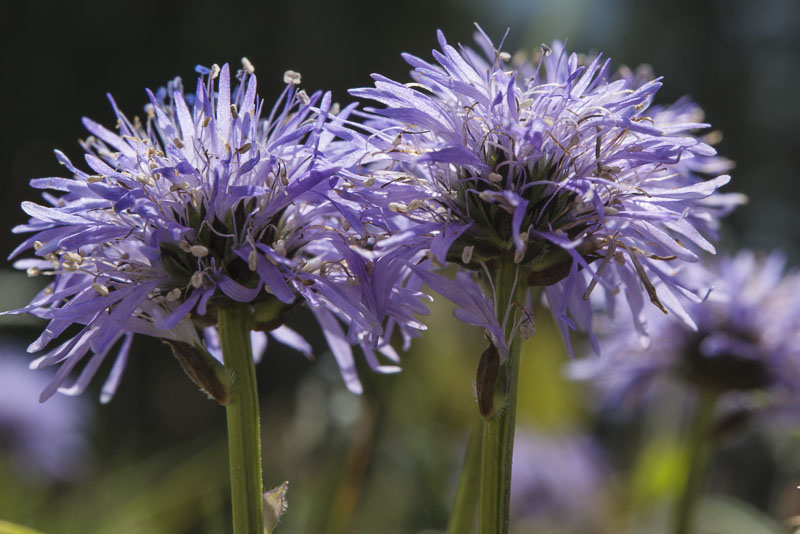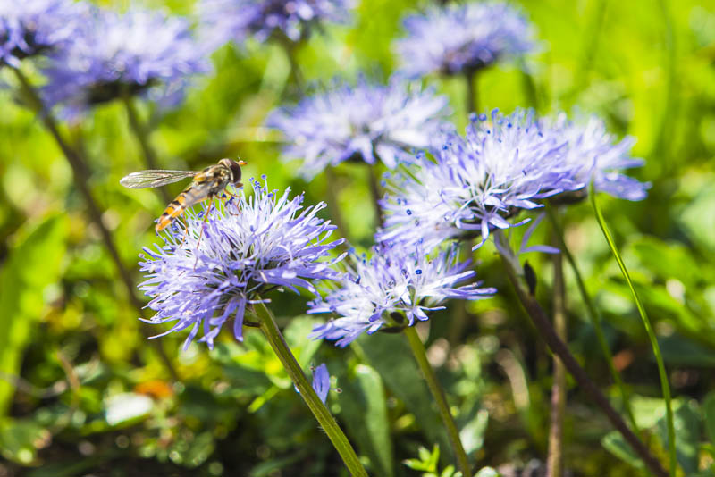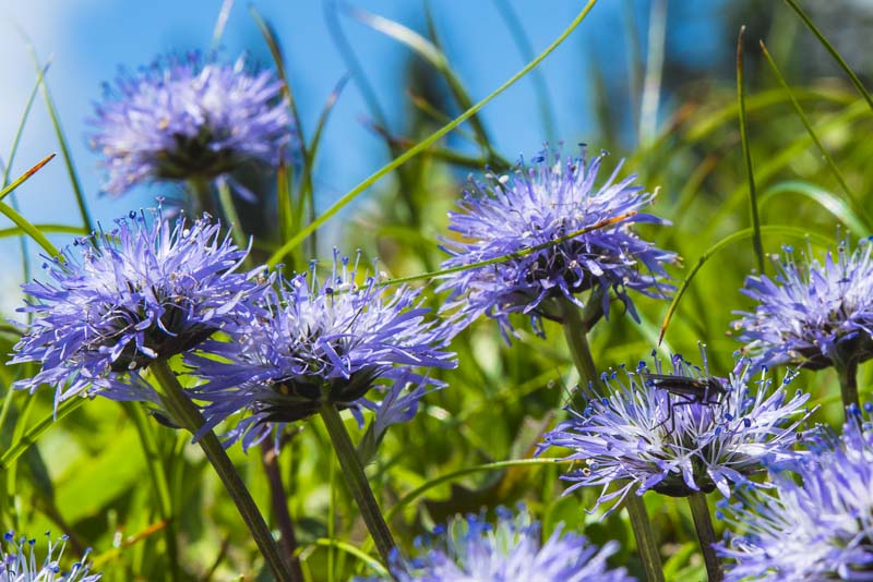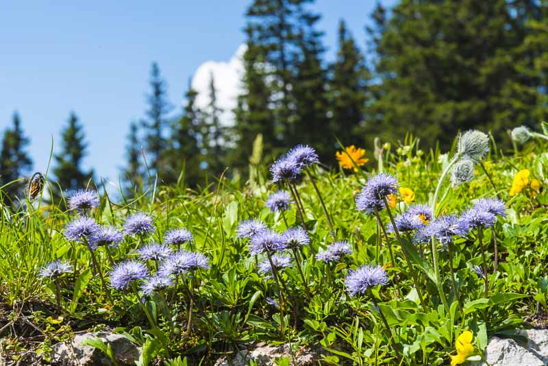 Auf etwas felsigen Stellen blüht hier heroben jetzt noch die Herzblättrige Kugelblume (Globularia cordifolia)