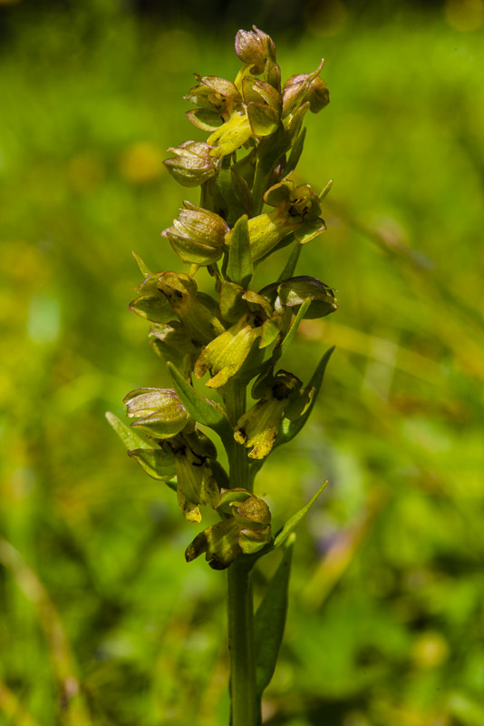Massenhaft Grüne Hohlzungen (Coeloglossum viride) an einem trockenen, sonnigen Platz.