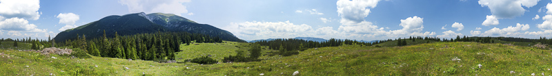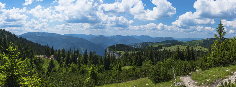 Panoramablick über den Ochsenboden, dominierend links der Schneeberg, rechts daneben die Rax. Hierher oder ins Bild klicken für eine größere Darstellung.