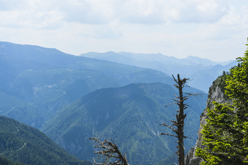 Blick zur Rax, dahinter die Schneealpe. Links neben der Spitze des rechten toten Baumes bin ich am 13.6.2013 gewandert.