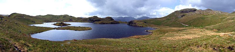 Panoram des Angle Tarn, mit dem Brock Crag dahinter und der südlichen Angle Tarn Pike ganz rechts. Hierher oder ins Bild klicken für eine größere Darstellung