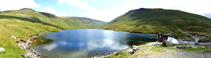 Panorama des Hayeswater mit The Knott, High Street und Grey Crag. Hierher oder ins Bild klicken für eine größere Darstellung.