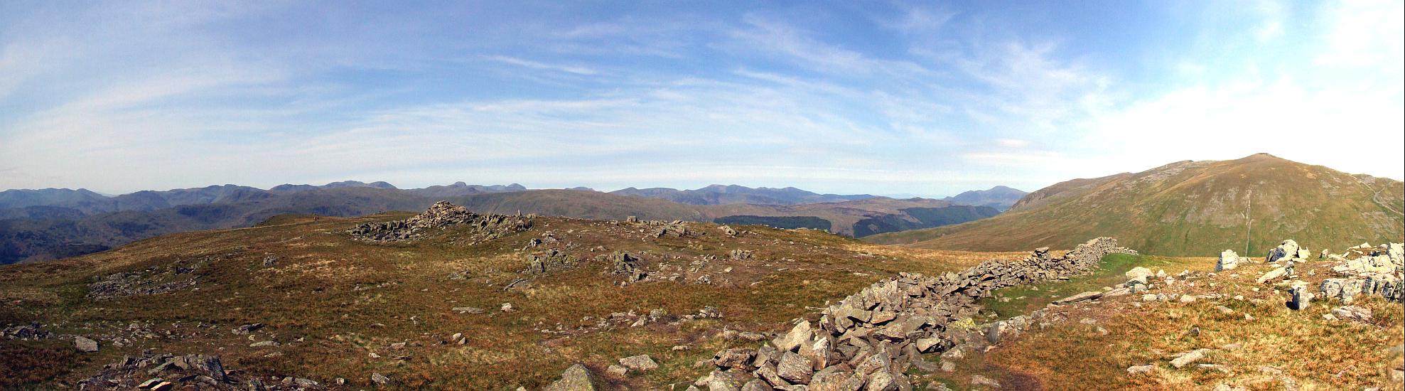 Nordwestliches Panorama vom Seat Sandal mit den Scafells, Gable und Pillar, den nordwestlichen Bergen, Skiddaw und Helvellyn.