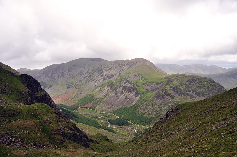 Ein schmaler Pfad führt mich links am Hang eine Abkürzung hinauf zum Pillar - Kamm, sodass ich mir den Umweg zum Black Sail - Pass erspare. Hier plötzlich der Blick frei zum High Stile - Kamm (High Stile, High Crag und Seat)