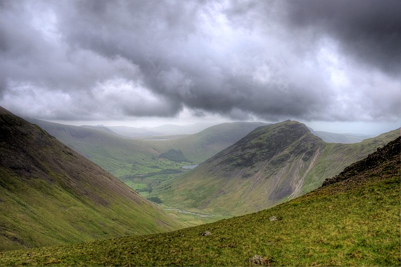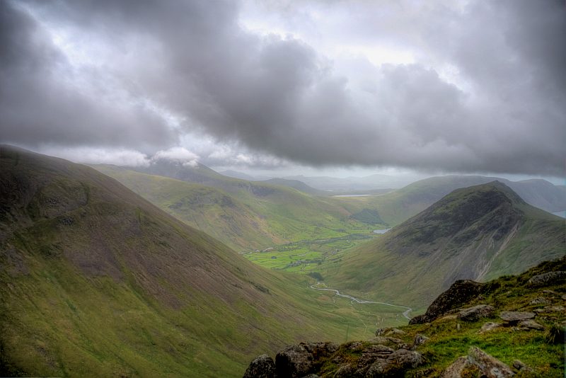 Blick hinunter über das Mosedale zum Wasdale Head. Man sieht gerade schon den Burnmoor - See.