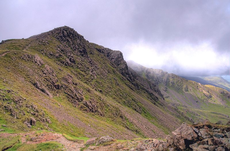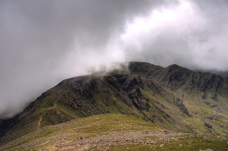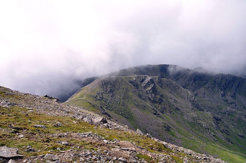 Black Crag, mit Steeple dahinter, teilweise im Nebel.