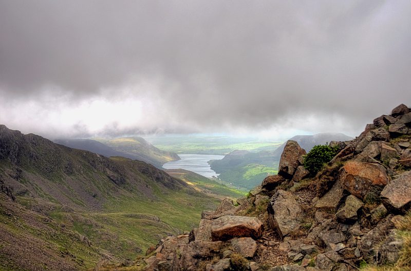 Erst als ich von der Red Pike wieder herunten bin, komme ich unter den Nebel. DIes ist also das letzte Bild von meinem Abstieg über die steilen Schutthalden der Dorehead screes. Ganz rechts die Felsen des Yewbarrow.