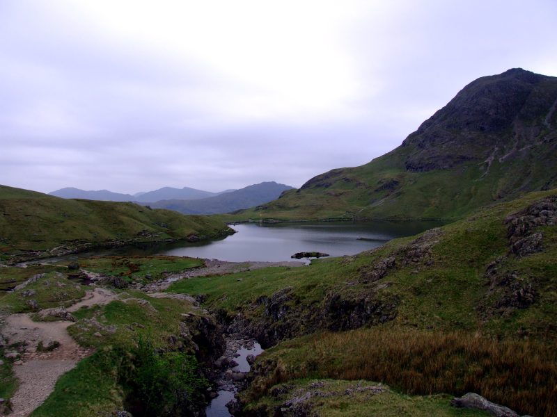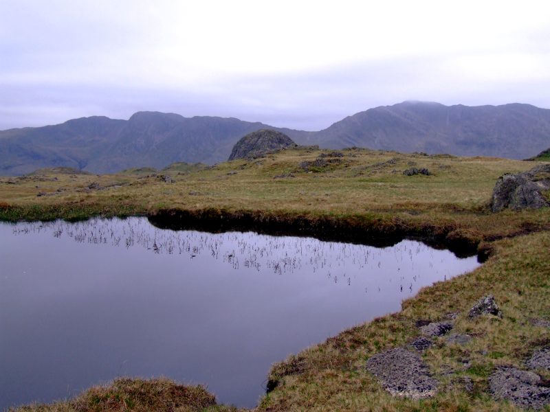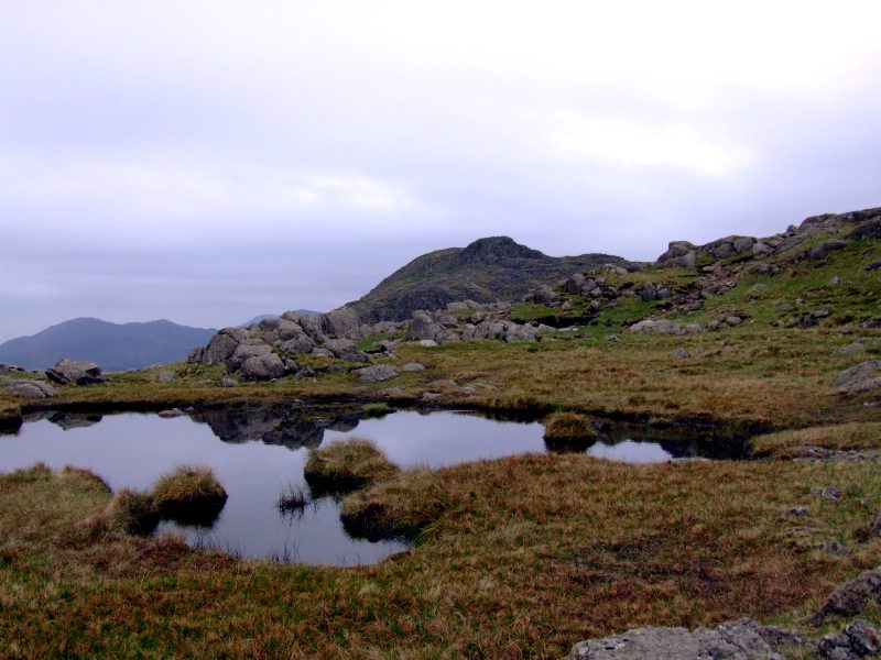 Heute ist das Wetter bedeckt, aber die Wolkenbasis ist hoch, sodaß die Sicht gut ist, auch hat es den ganzen Tag nicht geregnet. Dies ist der kleine Teich nahe meinem Zeltplatz, mit Pike o´Stickle dahinter.