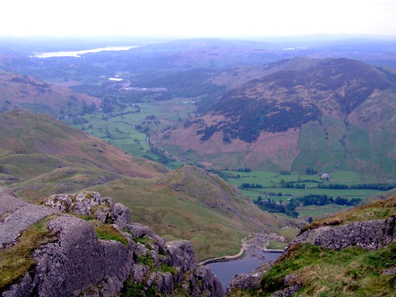 Blick vom ersten Crinkle - hinunter ins Oxendale und ins Große Langdale, die Langdale Pikes links und der Helvellyn - Kamm am Horizont.