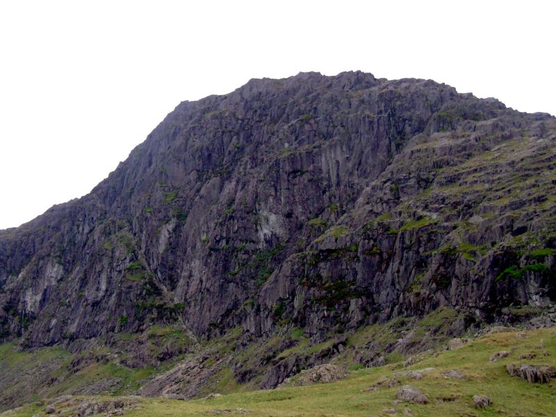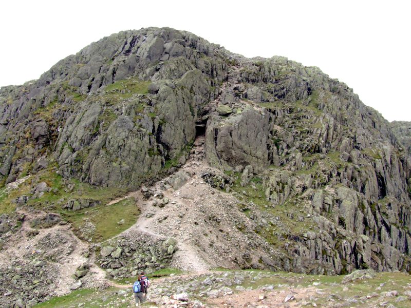 Pavey Ark. die linke der beiden, zusammen ein "V" nachzeichnenden Linien ist ein felsiger Aufstieg mit Kletterstellen namens "Jack´s Rake", den ich vermied für einen morgendlichen Abstieg mit schwerem Gepäck und doch etwas steifen Beinen nach zwei langen Tagen.