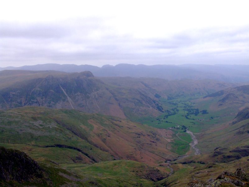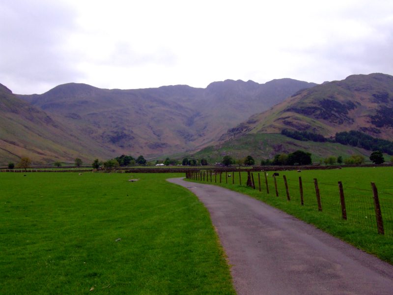 Auf der Talsohle des Great Langdale. Vor mir Stool End Farm und Oxendale, mit den Crinkle Crags dahinter, meinem nächsten Ziel.