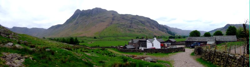 Stool End Farm und die Langdale Pikes in einem Panorama - hierher oder ins Bild klicken für eine größere Darstellung.