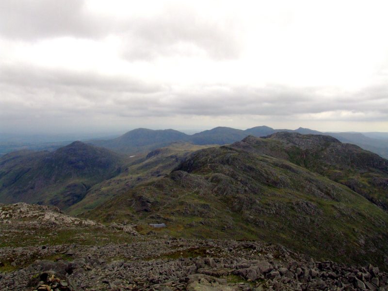 Blick vom Gipfel des Bowfell zu den Crinkle Crags, Pike o´Blisco links davon und die Coniston Berge im Hintergrund.