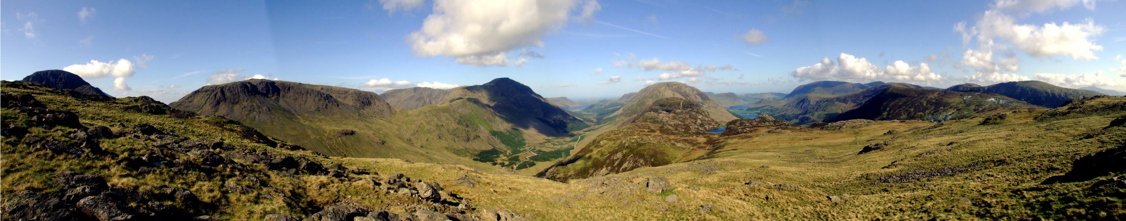 Panorama vom Moses Trod: Great Gable, Kirk Fell, Pillar, Ennerdale, der High Stile Kamm, Buttermere, Grasmoor und Fleetwith Pike.