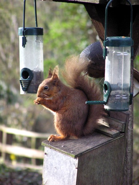 Ein rotes Eichhörnchen im Garten. Seit vor Jahren aus Amerika stammende graue Eichhörnchen ausgesetzt wurden, die gesunde Überträger eines für die roten Eichhörnchen tödlichen Virus sind, sind die roten Eichhörnchen in weiten Teilen Englands verschwunden.