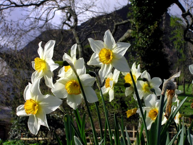 Vielfärbige Narzissen hinter dem Britannia Inn