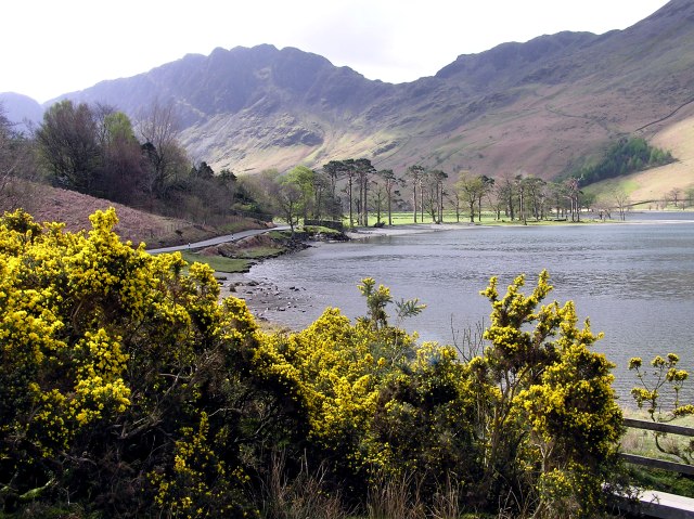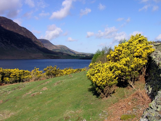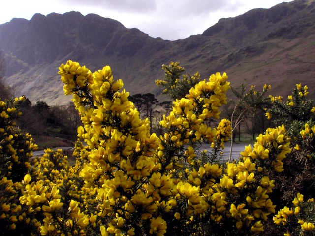 Wir starten nun unsere Reise gleich einmal mit einem kleinen Umweg durch das ganze Buttermere Tal: Crummock water mit farbenprächtigem Ginster