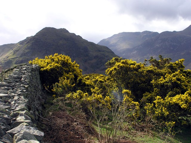 Die Steinmauer entlang der Straße mit Ginster und Rannerdale Knotts dahinter