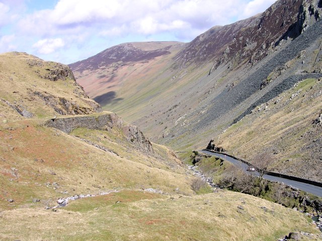 Die Straße durch das schmale Gatesgarth Tal zum Honister Pass