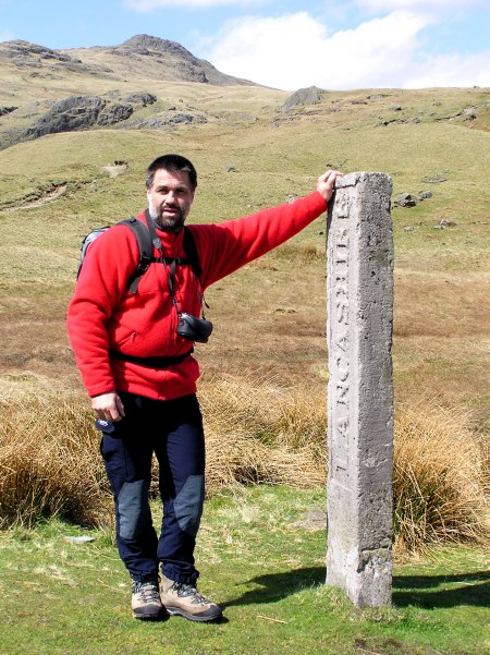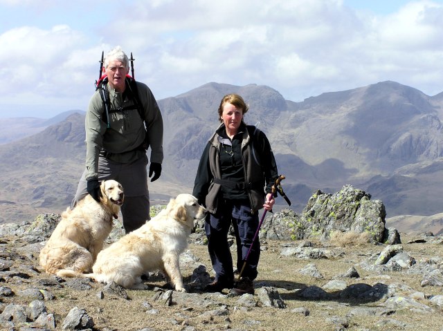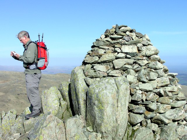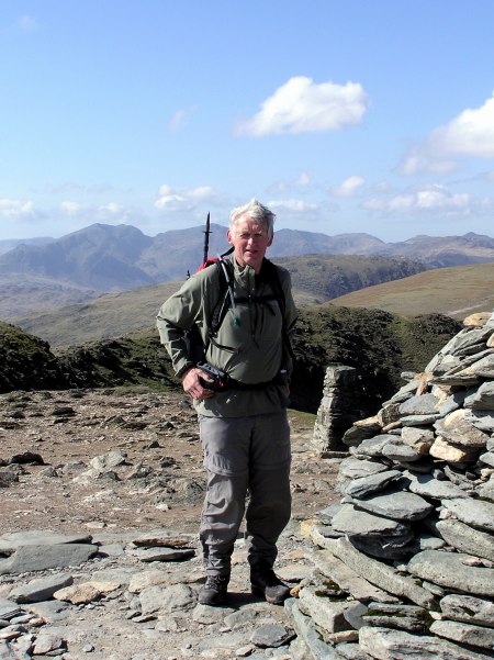 Roger Hiley am Gipfel des "Old Man of Coniston", mit den Scafells im Hintergrund