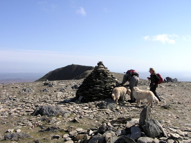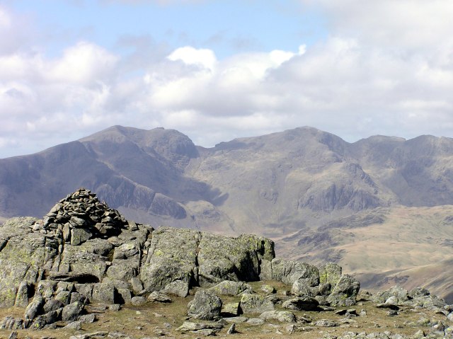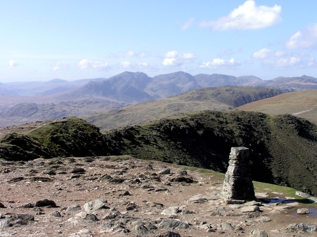 Steinmann am Gipfel des Brim Fell, dahinter der Gipfel des Coniston Old Man, der jetzt schon sehr nahe ist.