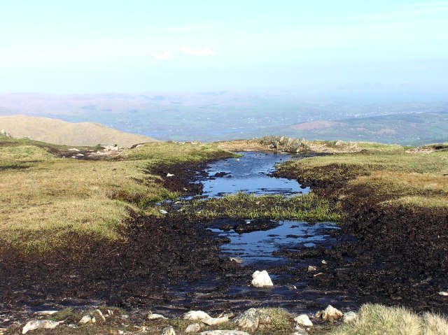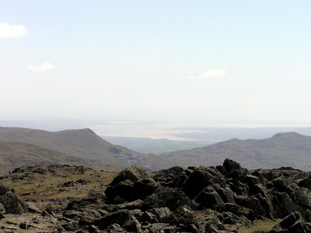 Wir wandern nun in südlicher Richtung und erreichen den Bergamm auf halbem Weg zum "Old Man". Blick nach Südwesten zum Seathwaite Tarn und Black Combe (links im Hintergrund)