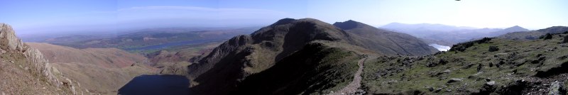 Panorama mit Levers Water, Brim Fell und Coniston Old Man, rechts der Seathwaite Tarn. Ins Bild klicken für eine größere Darstellung.