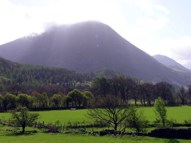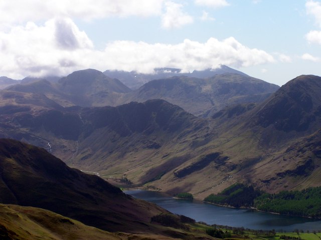 The Scafells still in clouds, Great Gable in front, being free. Buttermere lake in the foreground.