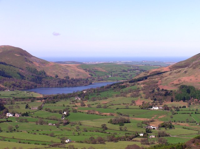 Loweswater village and lake, with the Irish sea in the background.